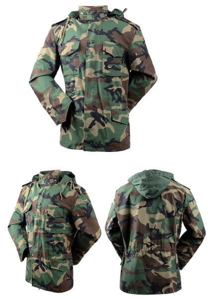Maskáčová bunda v armádním stylu ve střihu M65 s vyjímatelnou prošívanou vložkou. V kamufláži woodland. Díky vložce lze bundu použít v zimě, bez vložky pak na jaře a podzim.