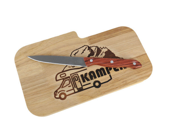 Stylové dřevěné prkénko s gravírovaným motivem karavanu pod Malým Rozsutcem a logem KAMPER.cz. Součástí je praktický nůž s dřevěnou rukojetí, který se ukládá do vyfrézovaného zářezu – vždy po ruce na cestách i doma. Více informací