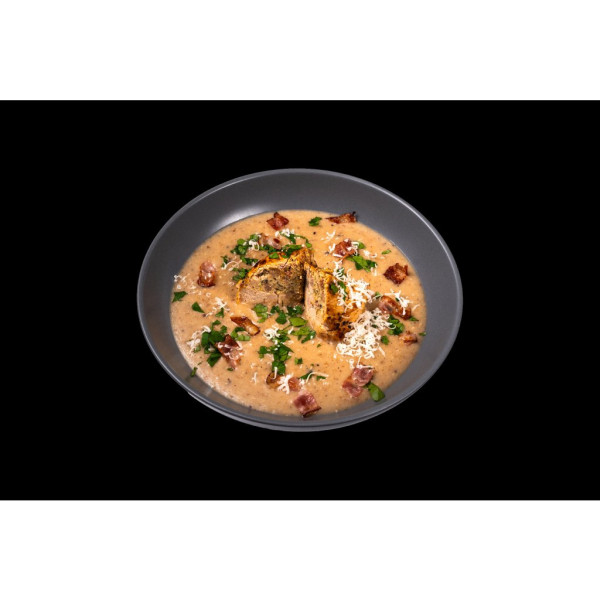 Šťavnatá kuřecí kapsa plněná zeleninou, salámem a sýrem, přelitá jemnou krémovou omáčkou se slaninou. Vydatné hlavní jídlo, které zahřeje a zasytí. Více informací