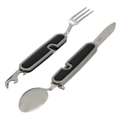 První část nože se skládá z vidličky, otvíráku na plechovky a víčka lahví, druhá část skrývá lžíci a samotnou čepel nože.