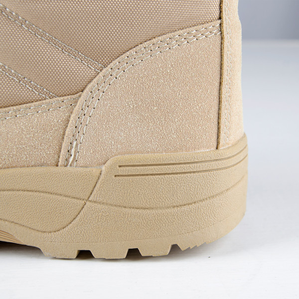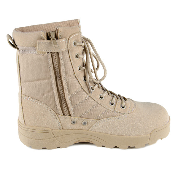 Taktické boty z naší military edice Smilodon v khaki/pískové barvě. Vyrobeny jsou z pravé hovězí kůže a nylonu, podrážka je ze syntetické gumy. Vybaveny jsou praktickým zipem, který usnadní obouvání. Více informací