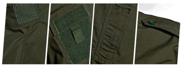 Taktická maskáčová souprava (kalhoty a blůza) ve stylu ACU (army combat uniform). V zelené military barvě. Vyrobeno z pevné tkaniny ripstop. Materiál 65% polyester 35% bavlna.
