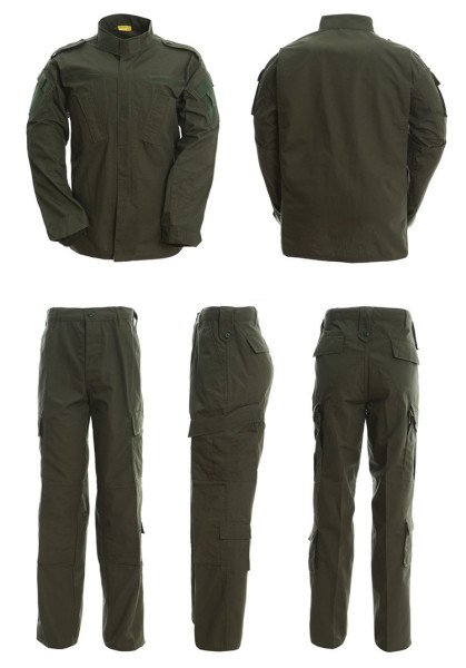 Taktická maskáčová souprava (kalhoty a blůza) ve stylu ACU (army combat uniform). V zelené military barvě. Vyrobeno z pevné tkaniny ripstop. Materiál 65% polyester 35% bavlna.