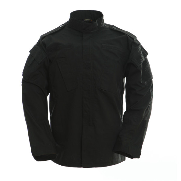 Taktická maskáčová souprava (kalhoty a blůza) ve stylu ACU (army combat uniform). V černé barvě. Vyrobeno z pevné tkaniny ripstop. Materiál 65% polyester 35% bavlna.