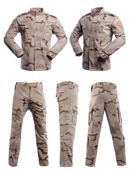 Taktická maskáčová souprava (kalhoty a blůza) ve stylu ACU (army combat uniform). Pouštní kamufláž tri-desert. Vyrobeno z pevné tkaniny ripstop. Materiál 65% polyester 35% bavlna.