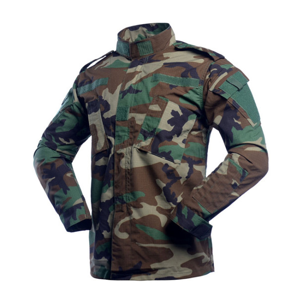 Taktická maskáčová souprava (kalhoty a blůza) ve stylu ACU (army combat uniform). Kamufláž woodland jungle. Vyrobeno z pevné tkaniny ripstop. Materiál 65% polyester 35% bavlna.