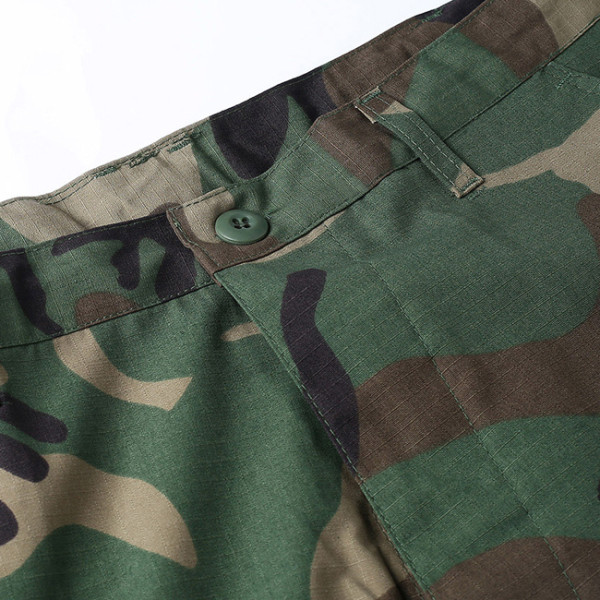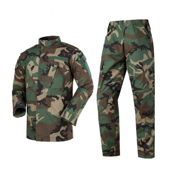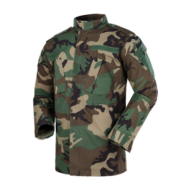 Taktická maskáčová souprava (kalhoty a blůza) ve stylu ACU (army combat uniform). Kamufláž woodland. Vyrobeno z pevné tkaniny ripstop. Materiál 65% polyester 35% bavlna.